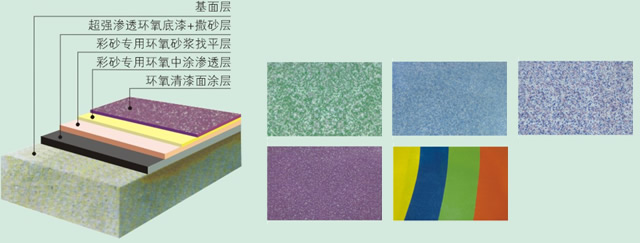 在進(jìn)行基底處理后,同時(shí)進(jìn)行超強(qiáng)滲透環(huán)氧底涂涂裝,施工配料時(shí)要注意施工進(jìn)度與用料的平衡,不可一次開料過多,保證材料在涂裝時(shí)仍符合可使用時(shí)間,在膠化前被涂刷完,讓材料保持良好的滲透性,保證粘接性能,并在凝膠前(涂裝后30分鐘內(nèi))均勻地拋撒40#-60#彩砂于表面。 |